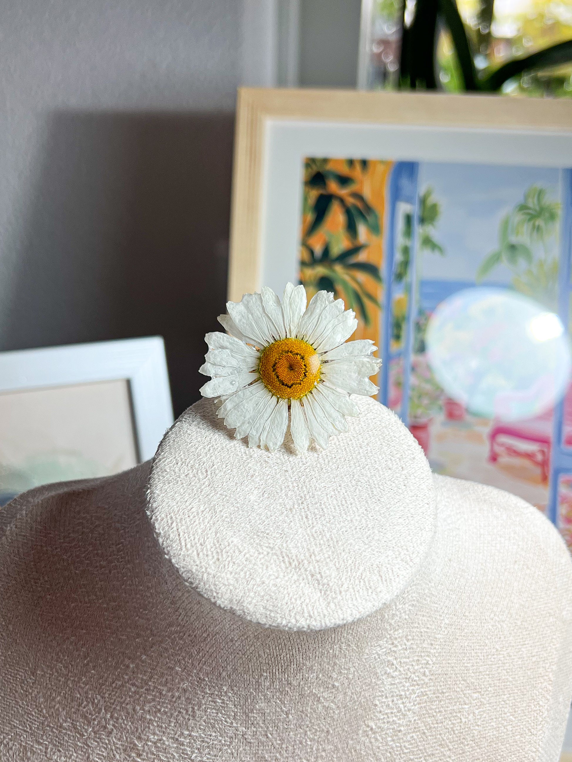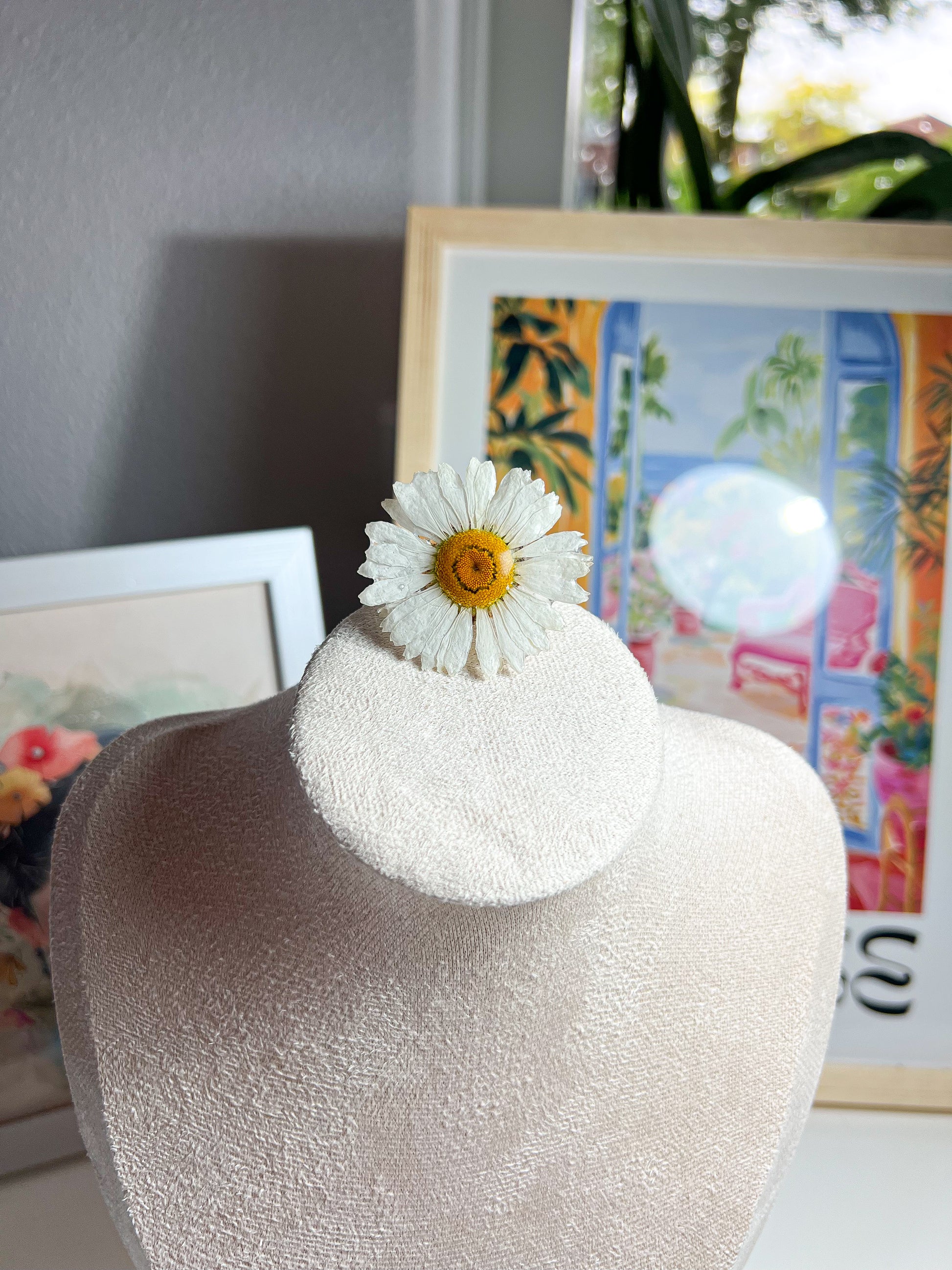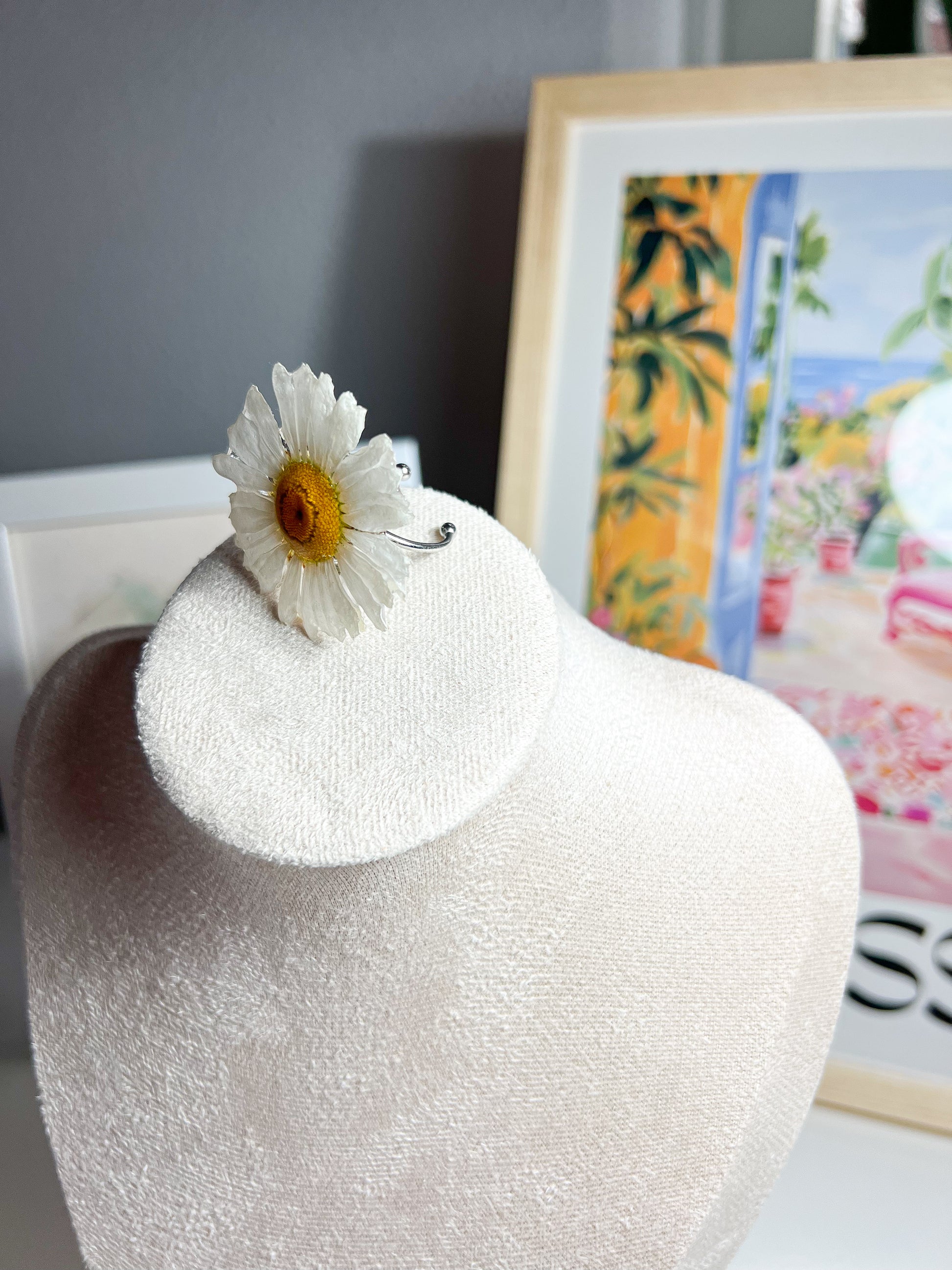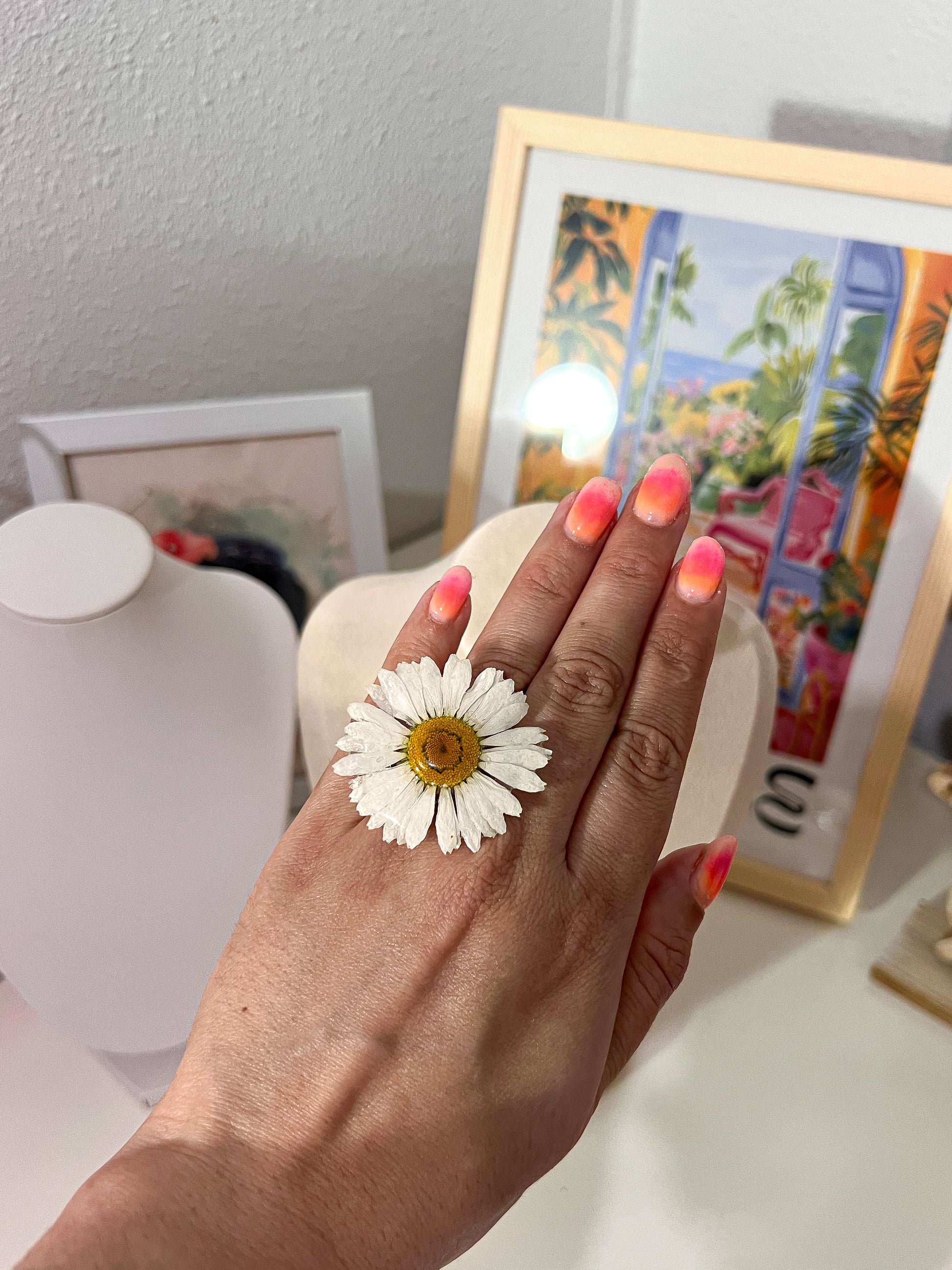 Este anillo captura la esencia de la libertad y la conexión con la naturaleza, con una margarita grande y auténtica que irradia frescura y vida. Su diseño sencillo y artesanal celebra la belleza imperfecta de lo natural, ideal para quienes buscan un estilo relajado, auténtico y lleno de energía positiva.