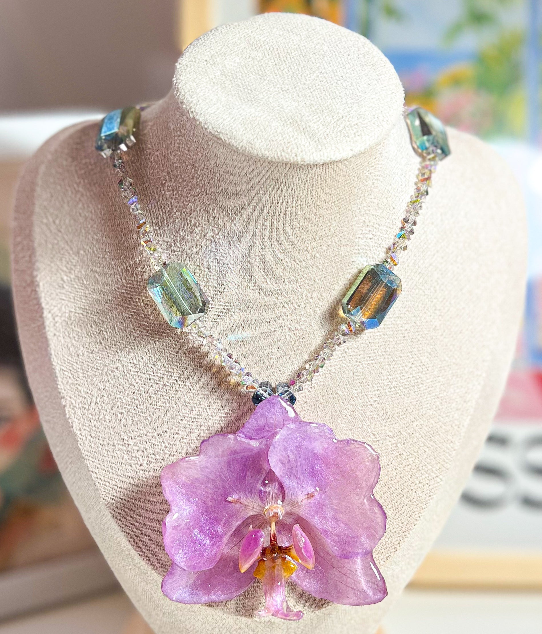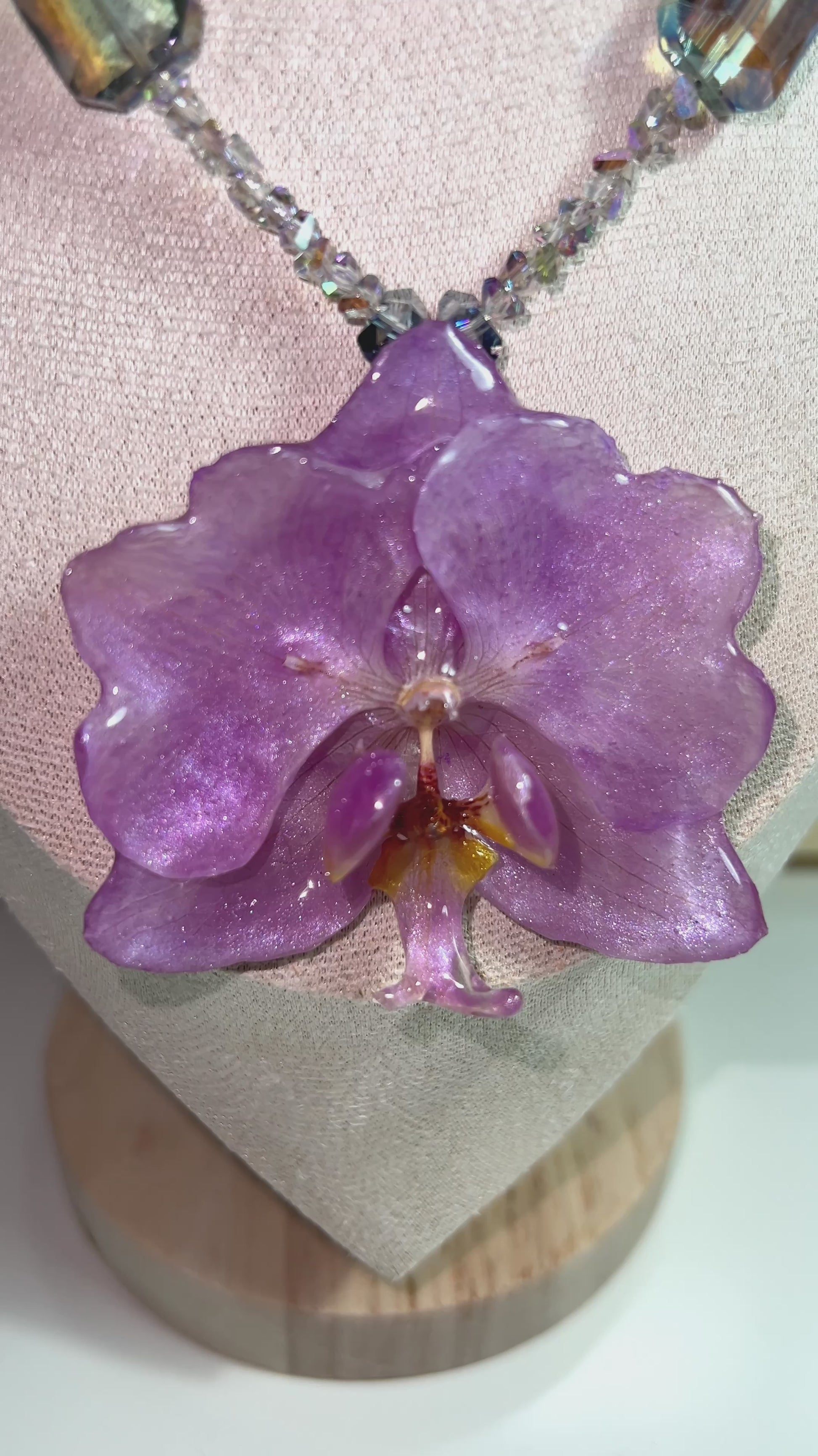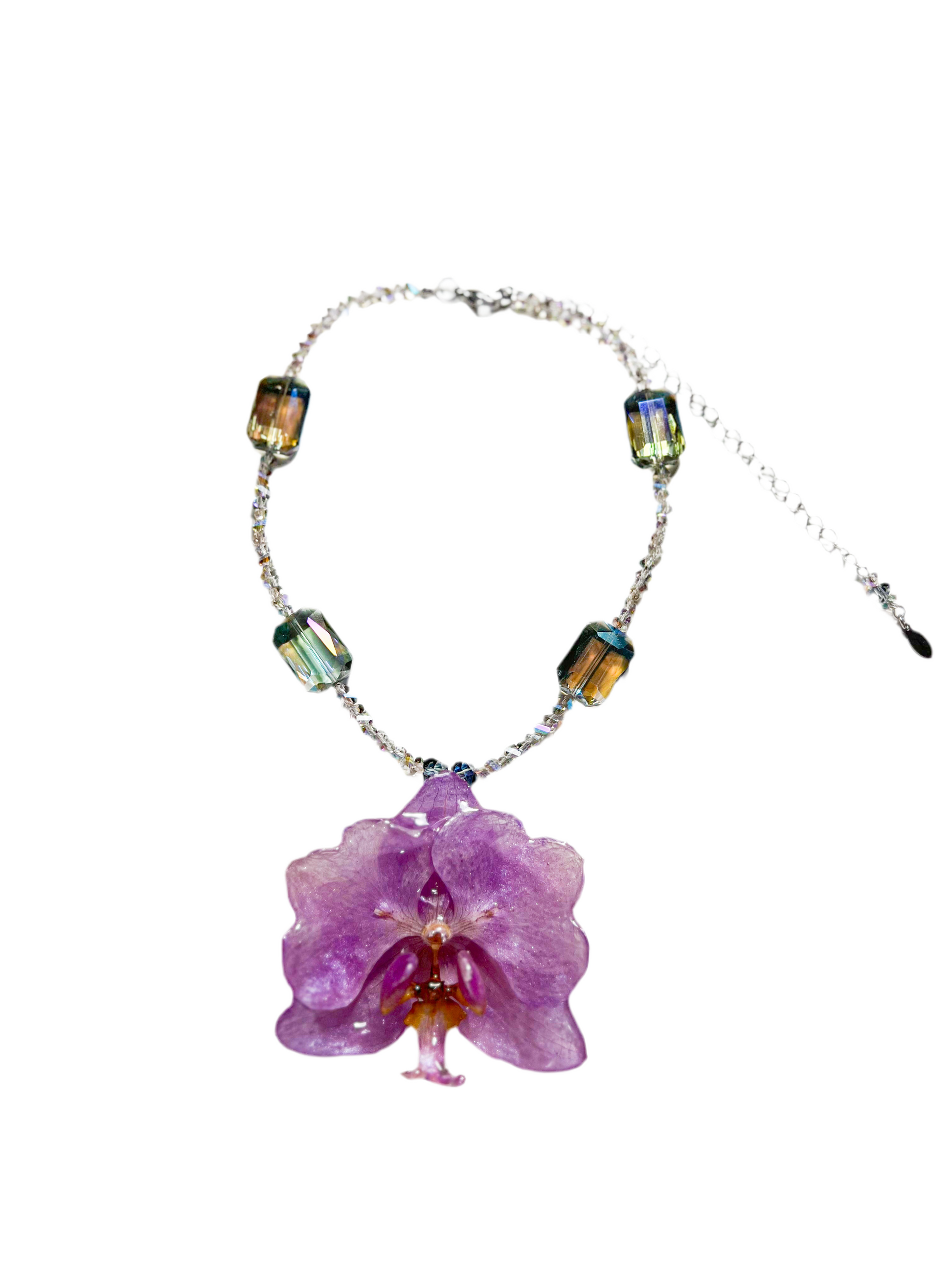 Déjate envolver por la magia de la naturaleza con este collar inspirado en la elegancia de las orquídeas. Su flor central, en un suave tono amatista, está modelada con detalle y delicadeza, como si acabara de florecer al amanecer. Las cuentas en tonos verdes y lilas, cuidadosamente seleccionadas, añaden destellos de luz que evocan rocío sobre pétalos. Una joya única, perfecta para quienes buscan llevar consigo una pieza de arte viva y atemporal.