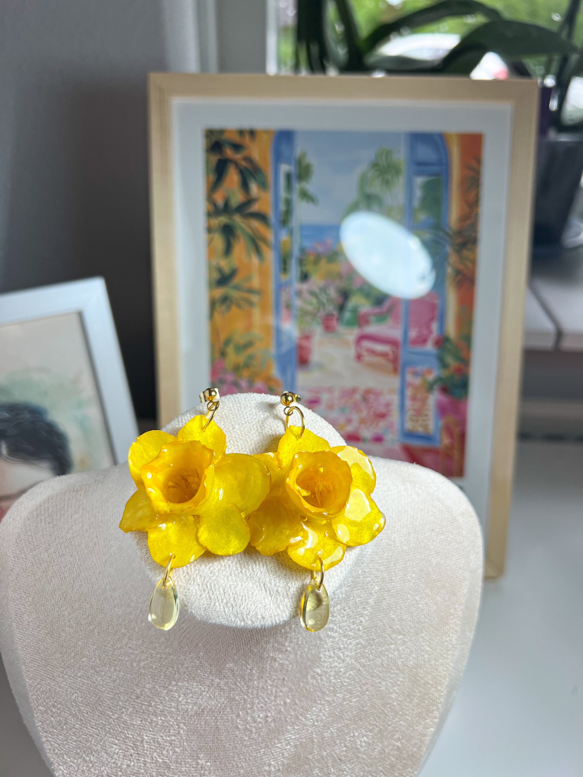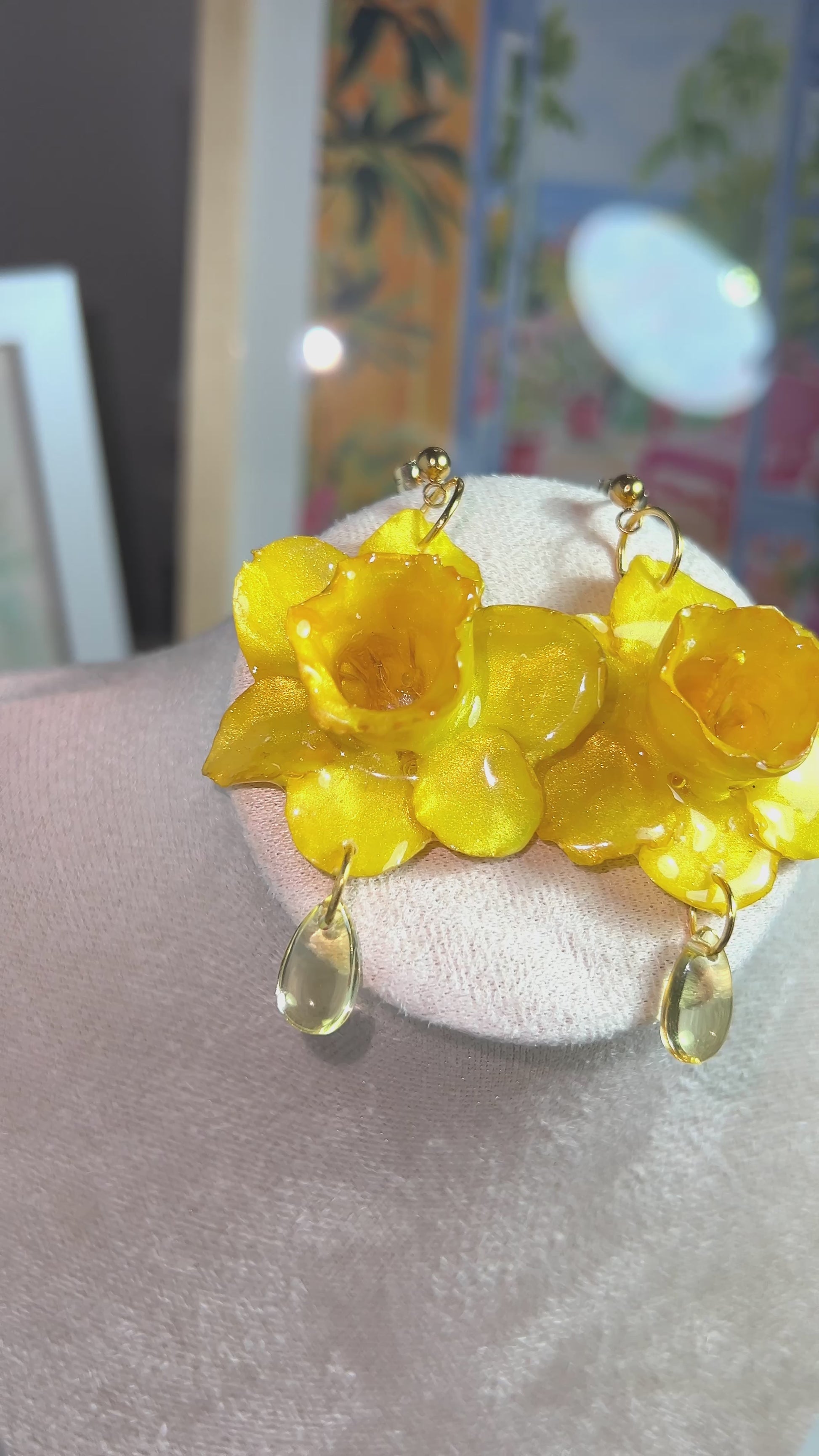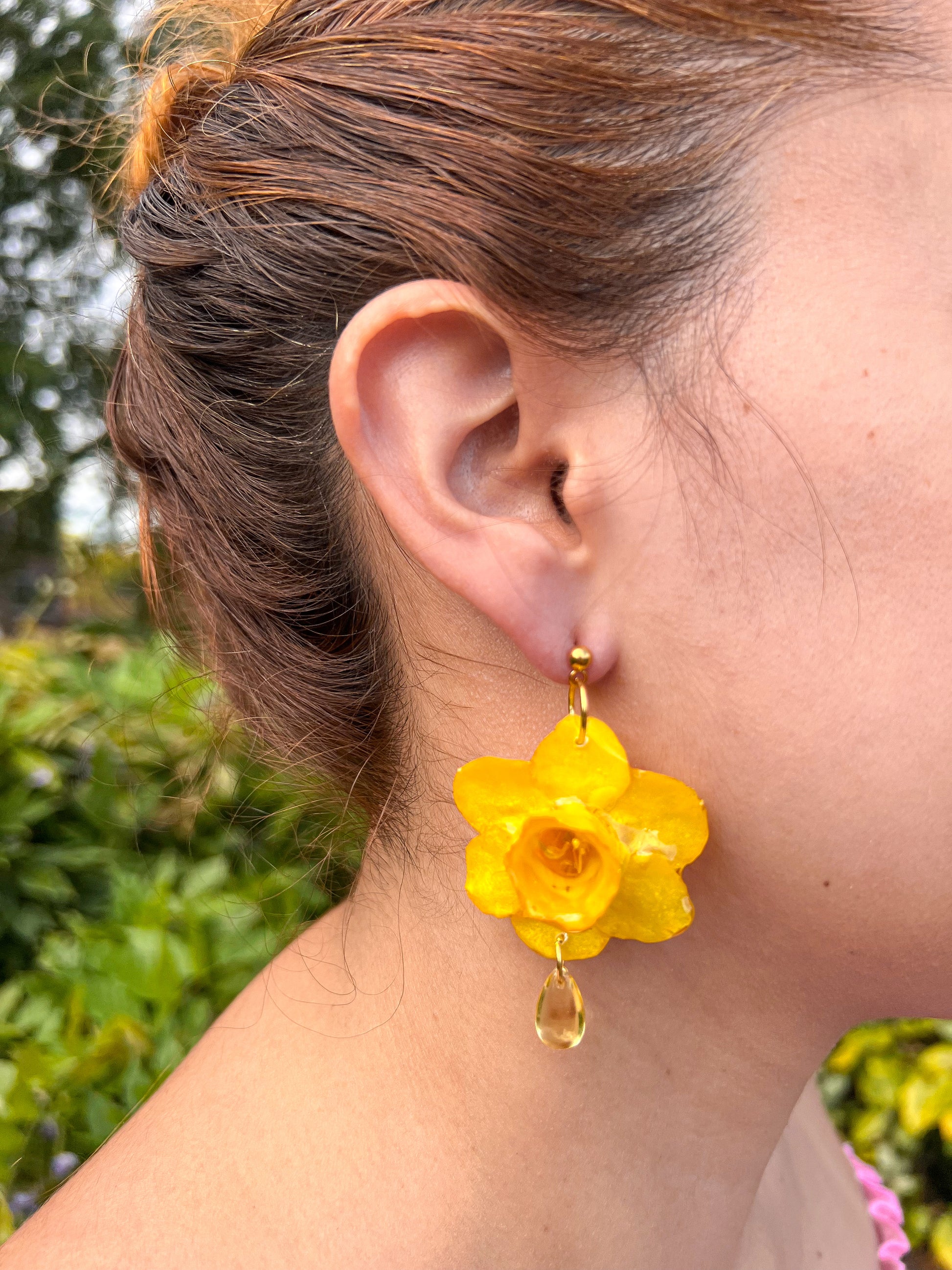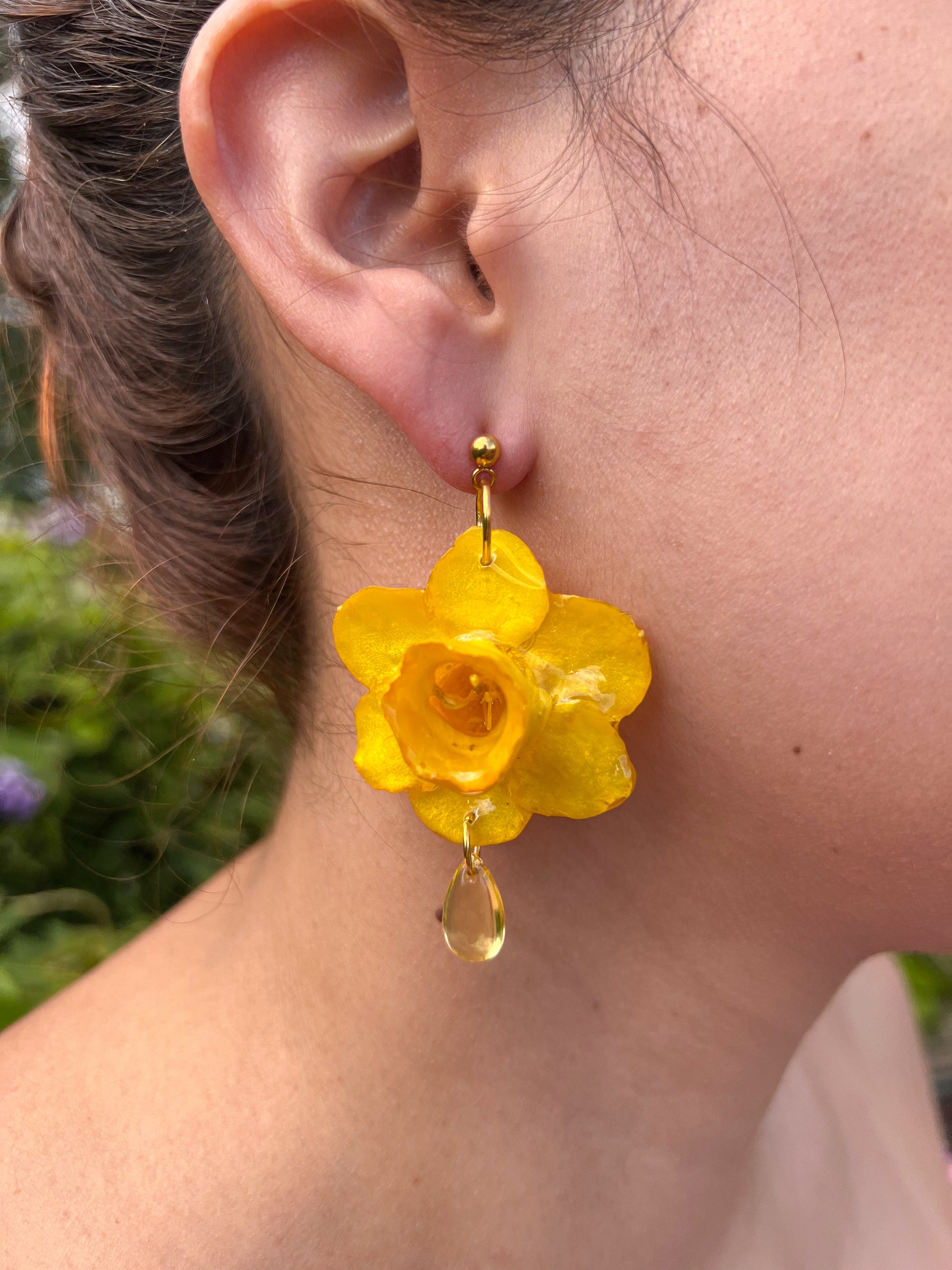 Estos pendientes artesanales capturan la esencia luminosa del narciso, una flor que florece con fuerza al comienzo de la primavera. Cada pieza está cuidadosamente hecha a mano, con una flor natural de narciso preservada en un vibrante tono amarillo dorado, acompañada por una gota de cristal que cuelga delicadamente, como el rocío al amanecer.