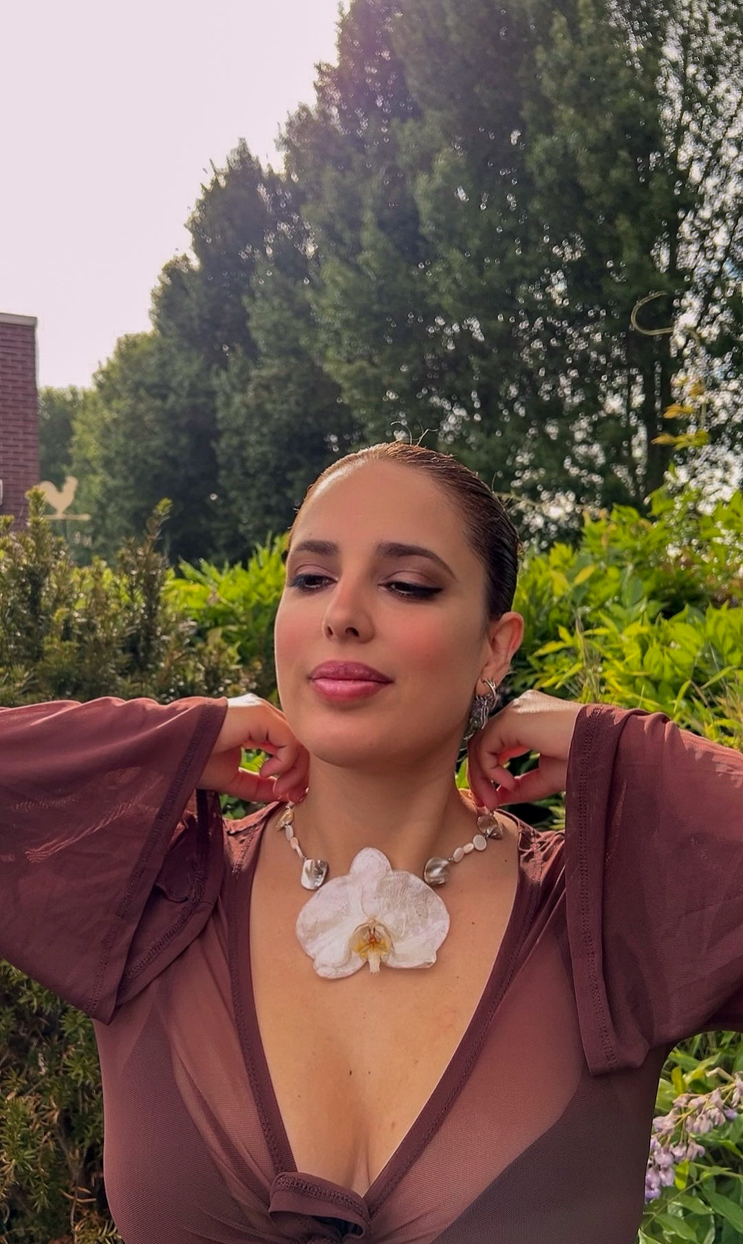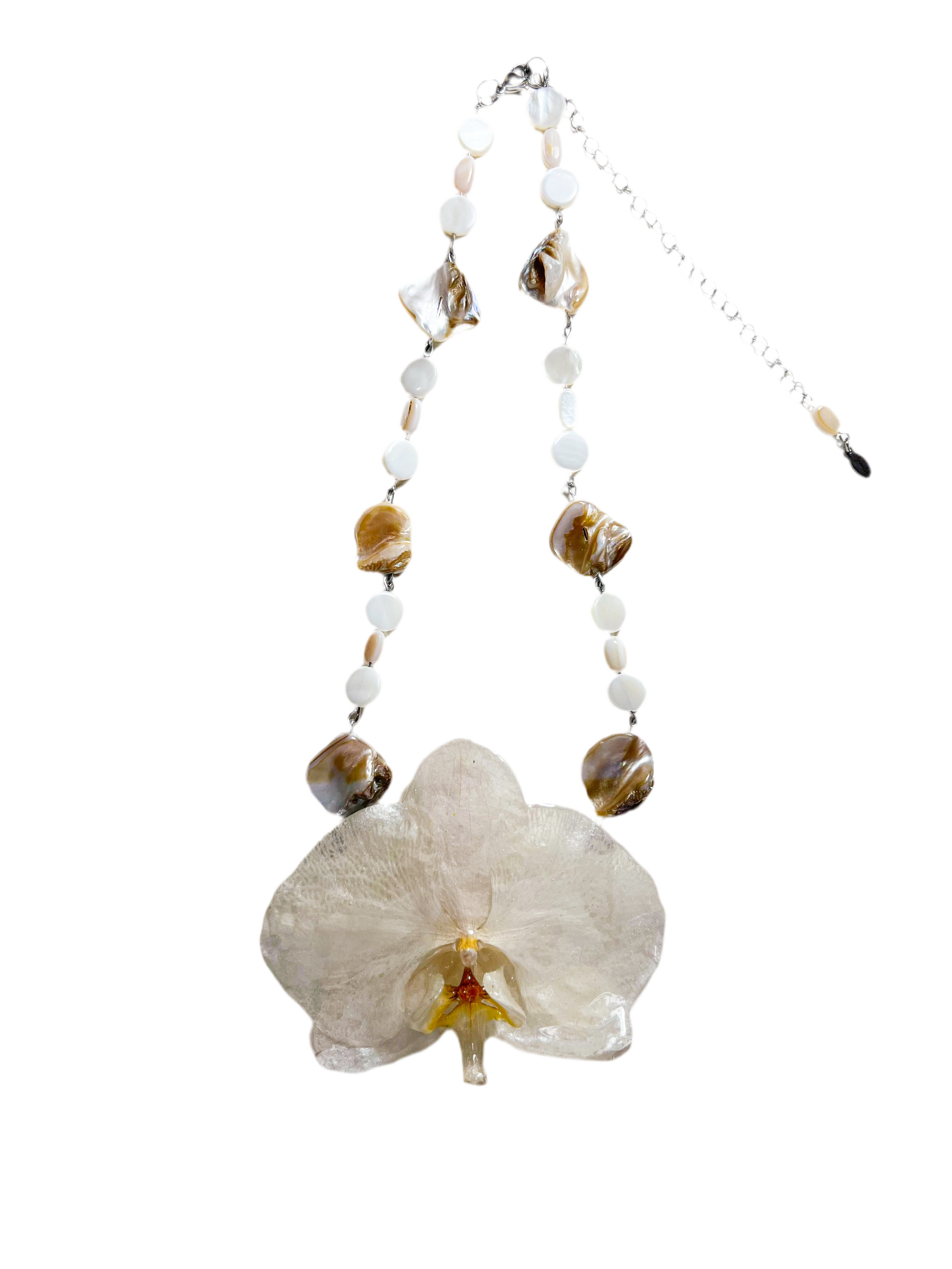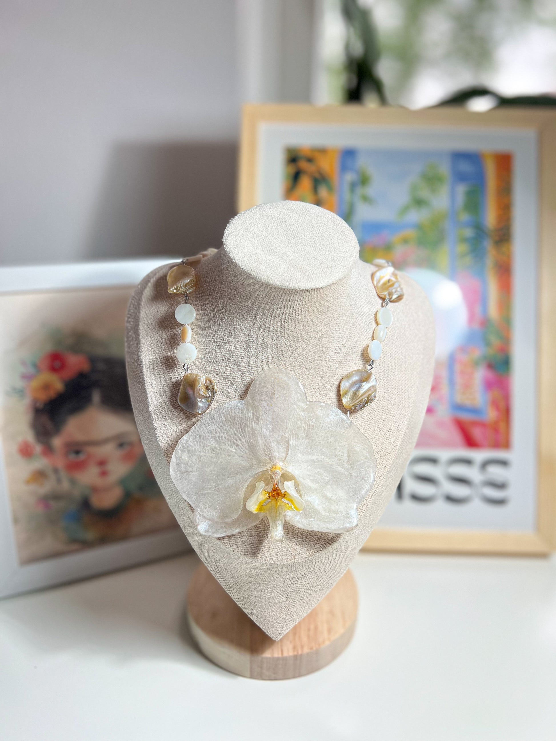 Este delicado collar presenta una orquídea blanca inspirada en la pureza de la naturaleza. Sus pétalos suaves y perfectamente delineados se combinan con cuentas en tonos crema y detalles plateados que aportan un brillo sutil y sofisticado. La pieza transmite calma y refinamiento, ideal para realzar la belleza natural con un estilo clásico y minimalista.