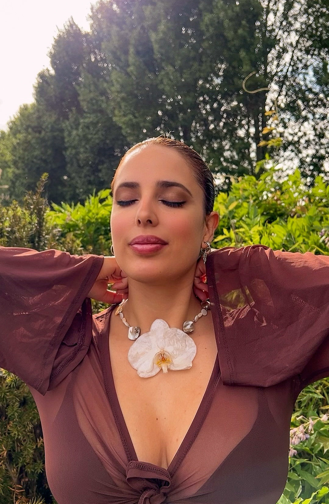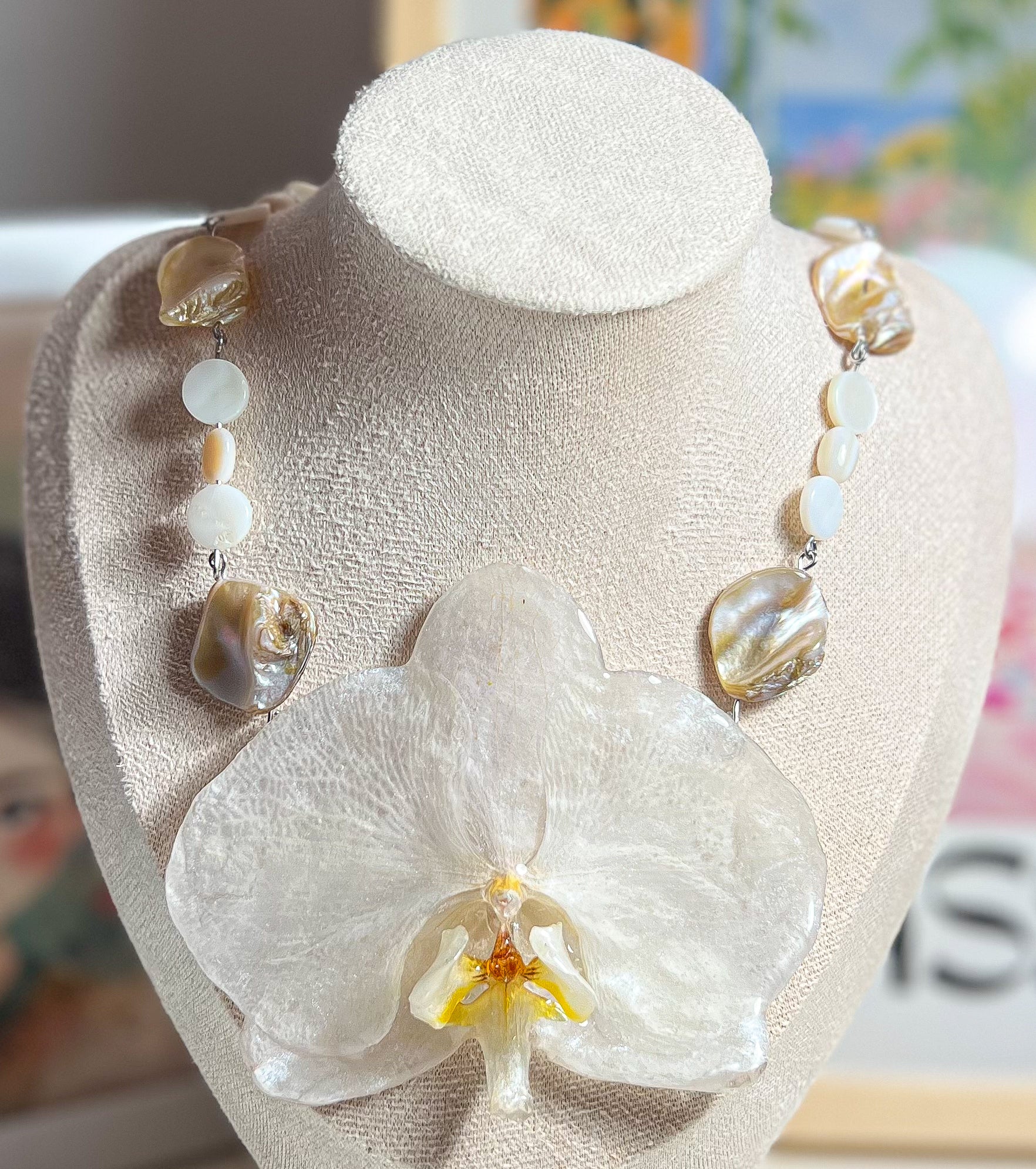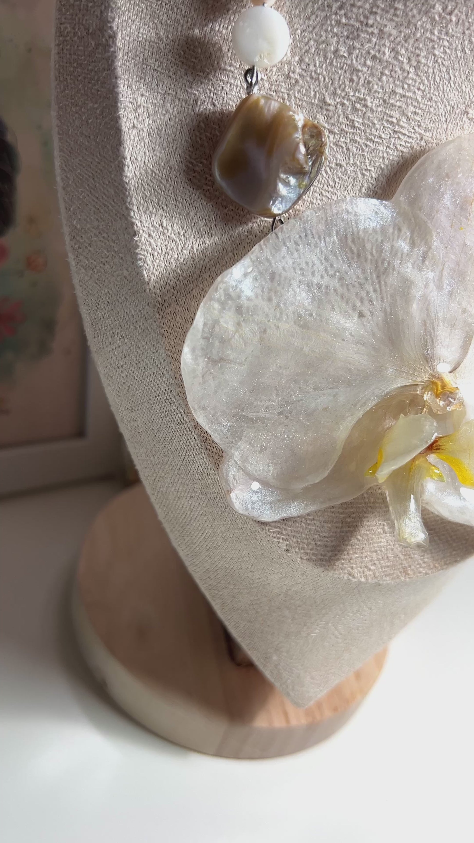 Este delicado collar presenta una orquídea blanca inspirada en la pureza de la naturaleza. Sus pétalos suaves y perfectamente delineados se combinan con cuentas en tonos crema y detalles plateados que aportan un brillo sutil y sofisticado. La pieza transmite calma y refinamiento, ideal para realzar la belleza natural con un estilo clásico y minimalista.
