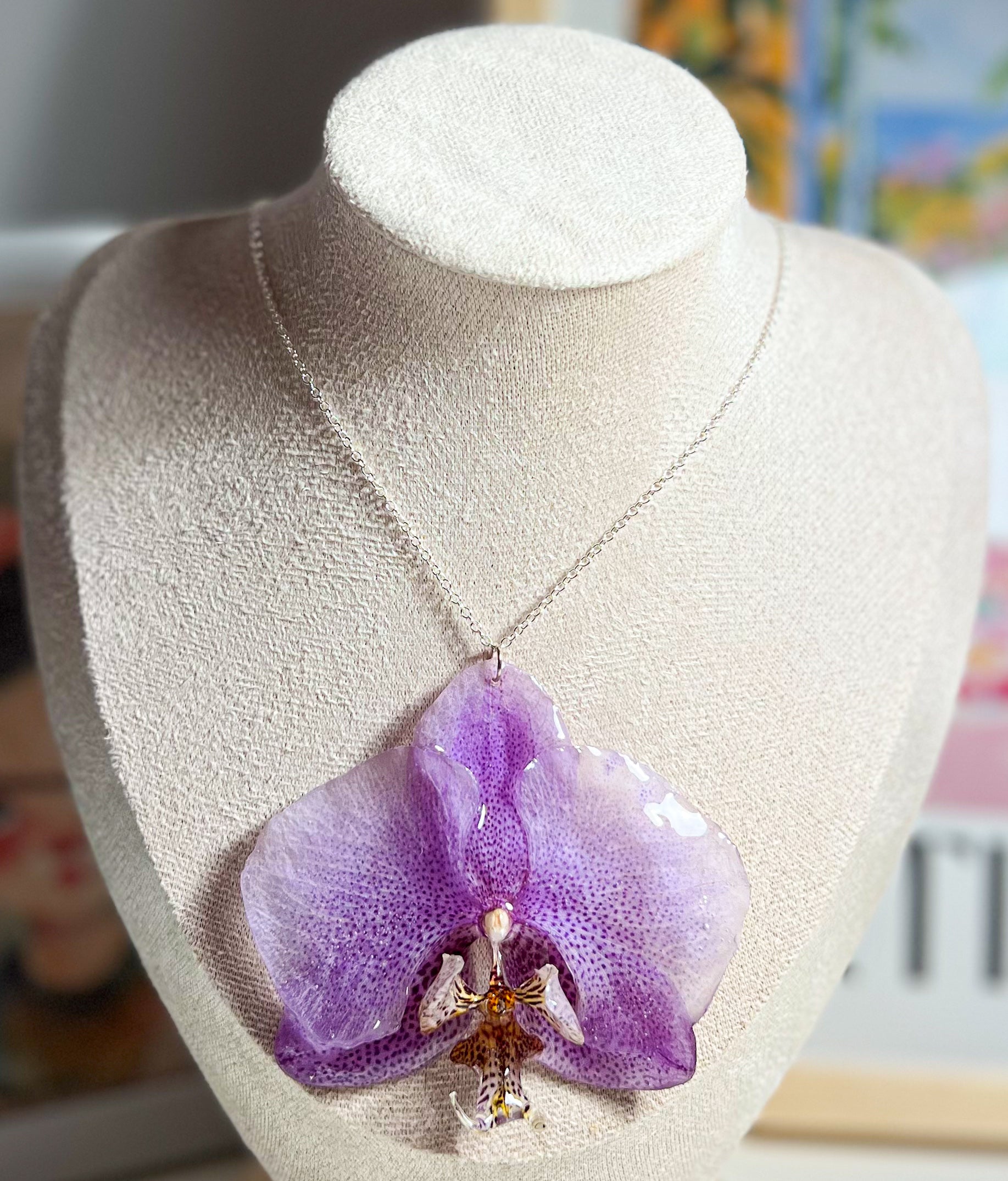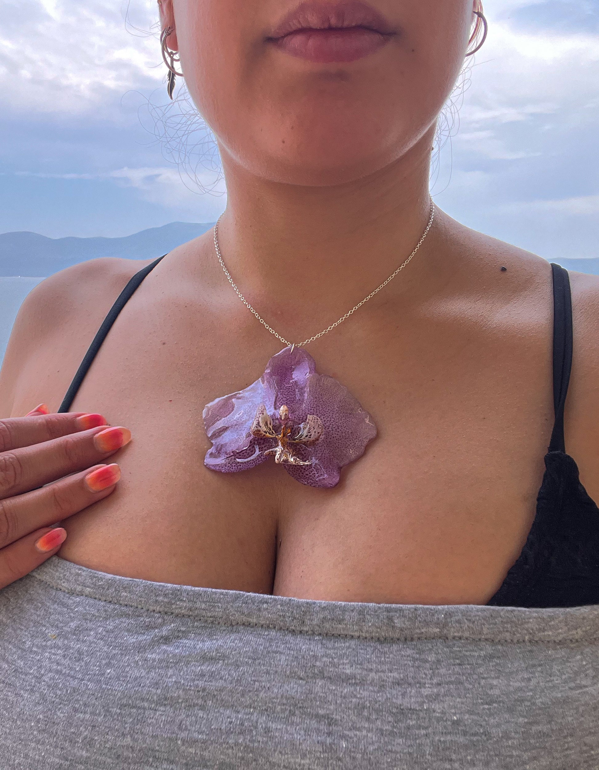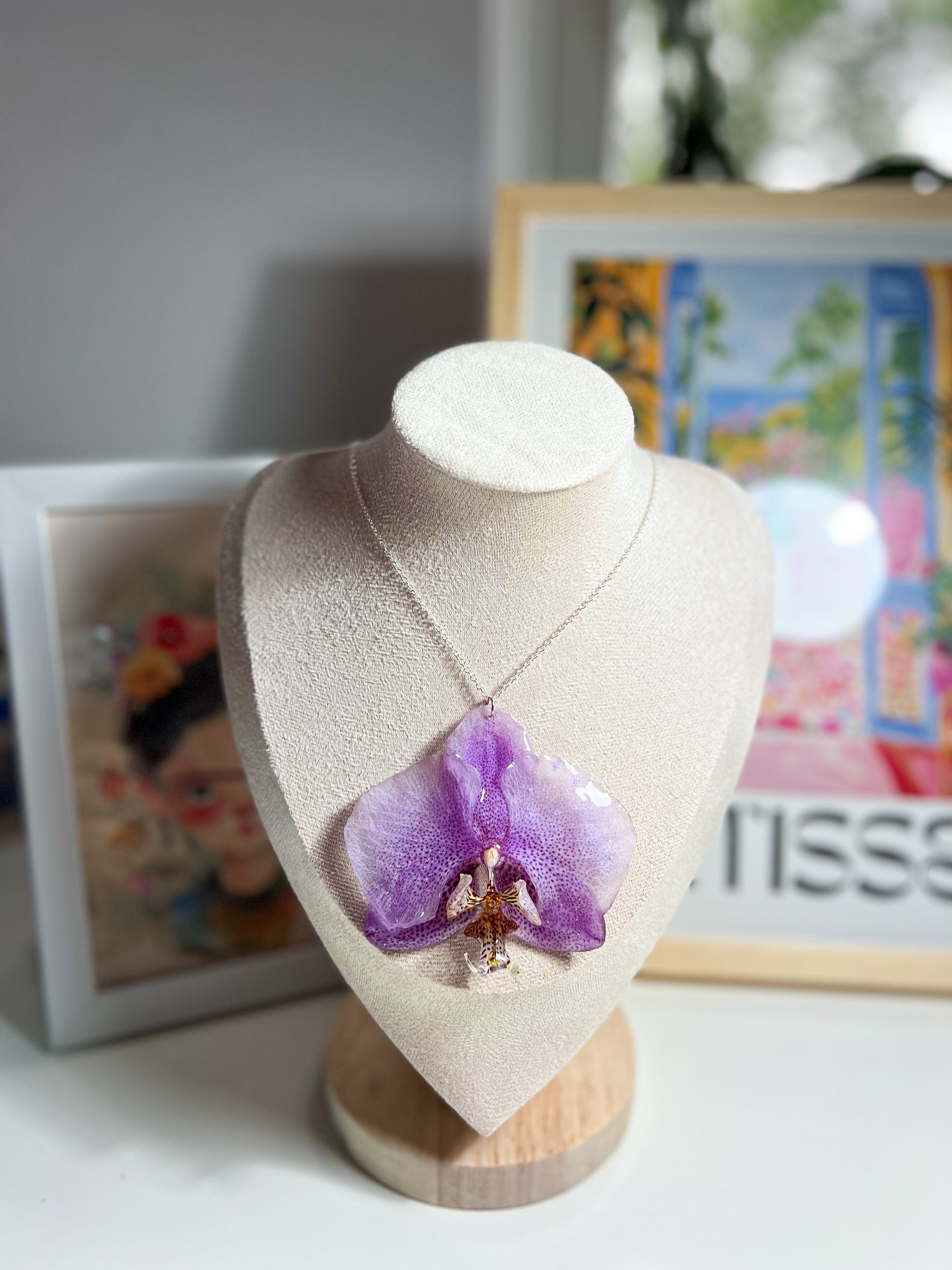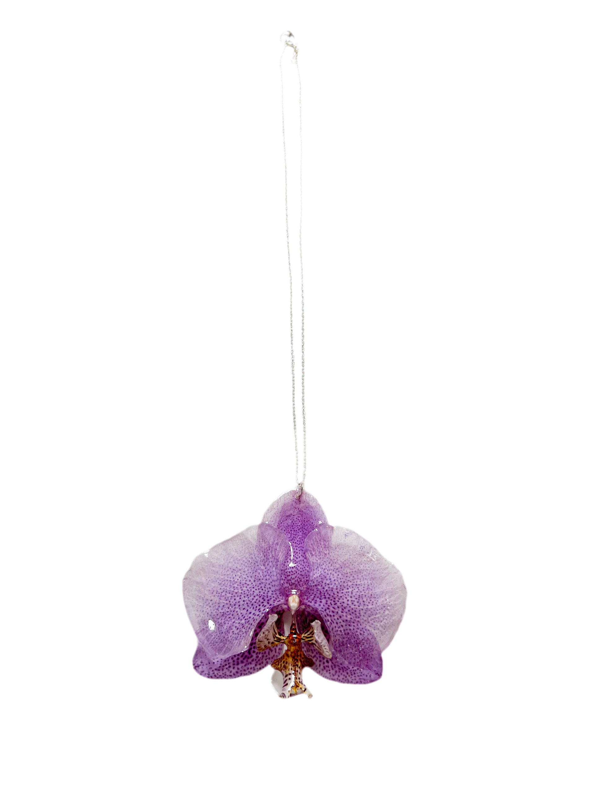 Esta delicada pieza celebra la belleza pura y orgánica de la naturaleza. En su diseño destaca una auténtica orquídea Phalaenopsis, teñida suavemente en tonos lavanda y violeta, preservada y encapsulada a mano en resina cristalina para conservar su forma y color eternamente.